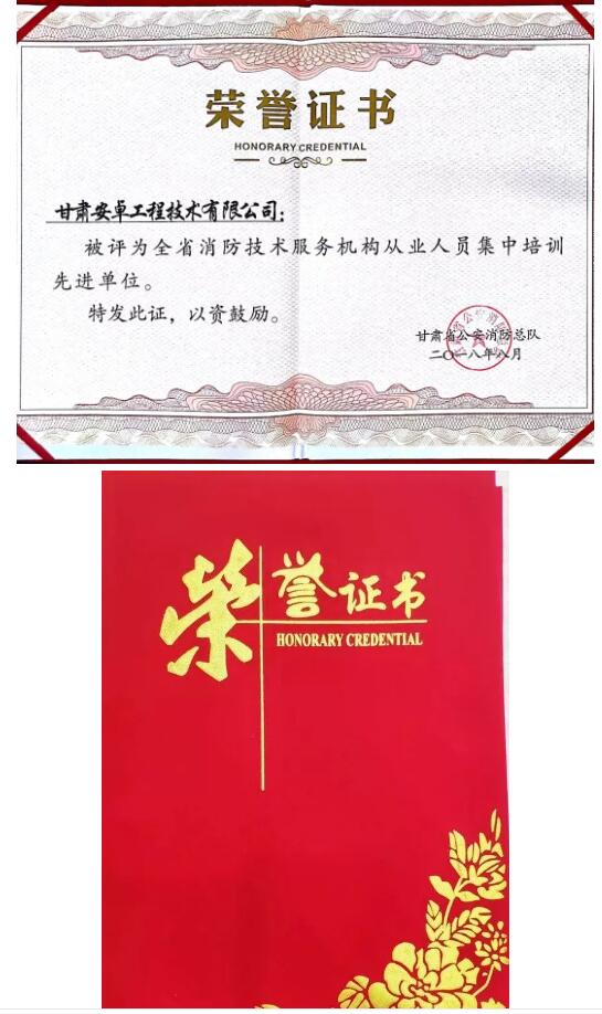 2018年8月6日至8月17日,由甘肅省公安消防總隊組織的甘肅省消防技術服務機構從業人員集中培訓在蘭州市七里河區萬壽宮大酒店開展,甘肅安卓工程技術有限公司消防部全員參加了為期兩周的培訓。在此次培訓中,我司消防部人員上課積極,嚴格遵守現場紀律,上課期間積極跟老師互動,最終被評為“全省消防技術服務機構從業人員集中培訓先進單位。”